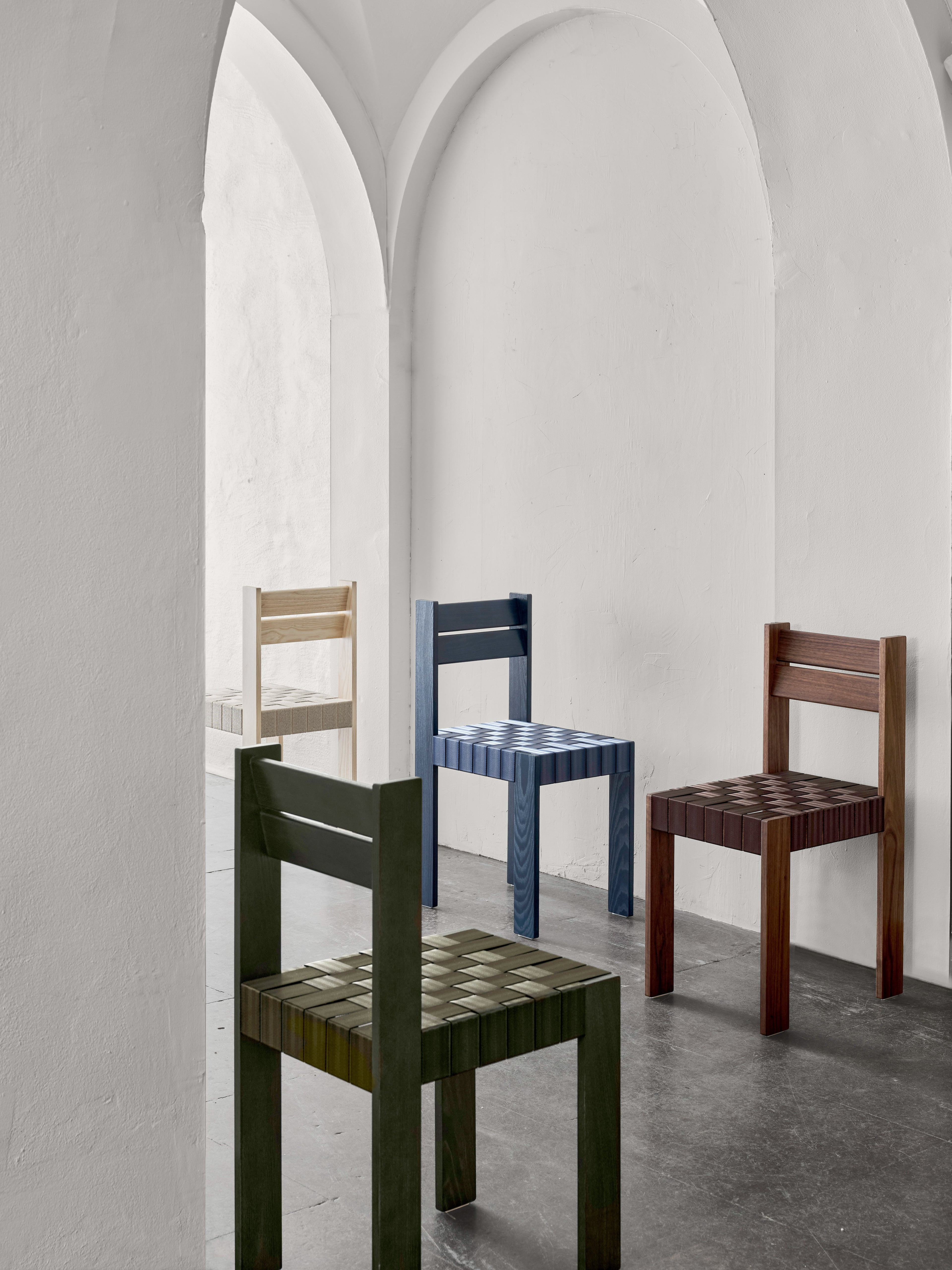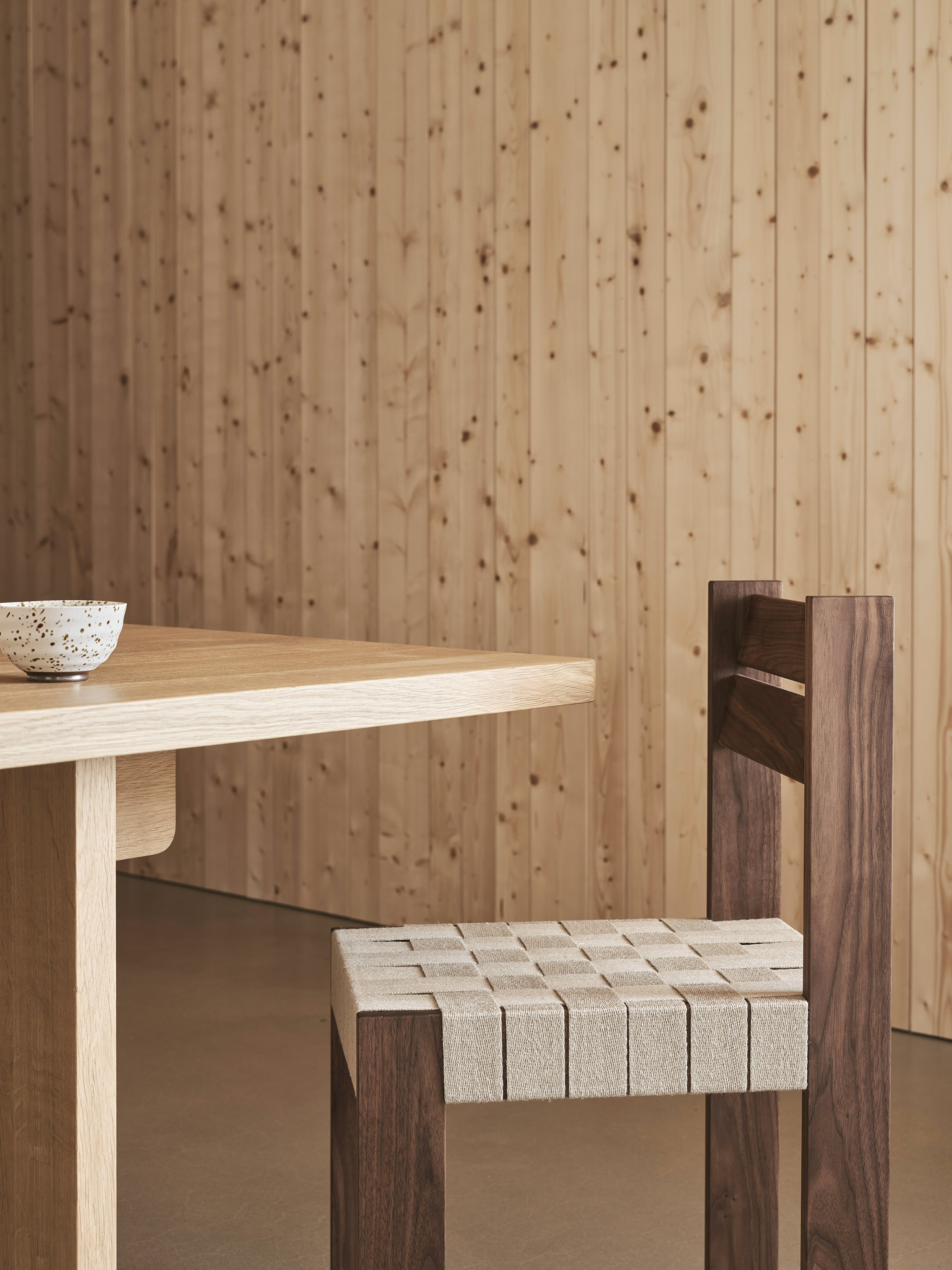 Momang takes as its inspiration two former chairs by Johan Lindau. Gutang is still used in Swedish restaurants, while the first version of Momang thrives in many cafés. Johan Lindau offers improved comfort and a timeless graphic expression two decades later, with plaited webbing as a seat. The ascetic retro is strikingly pronounced with a sturdy and thick expression seen sidewise, and thin and slender seen from the front.