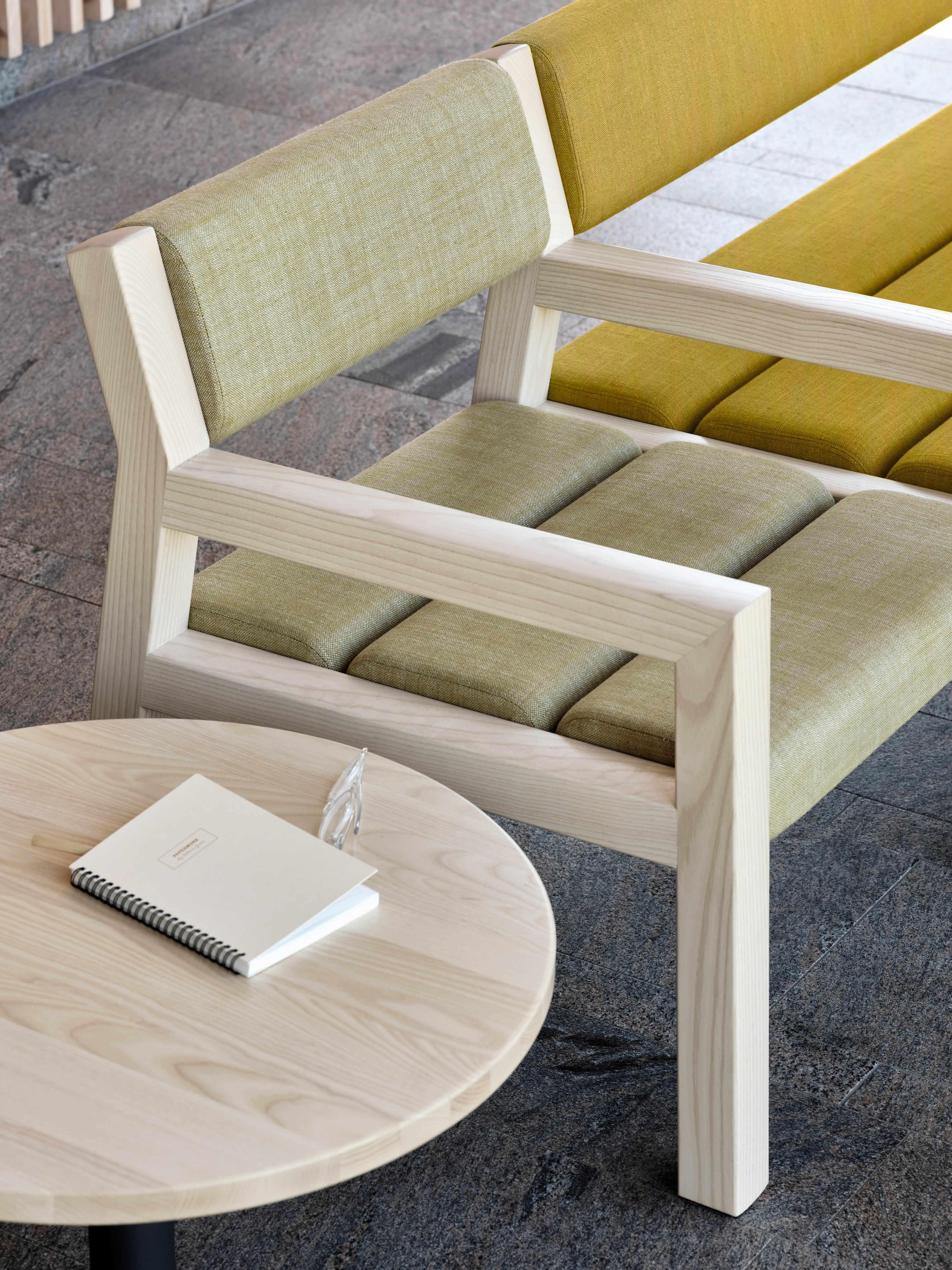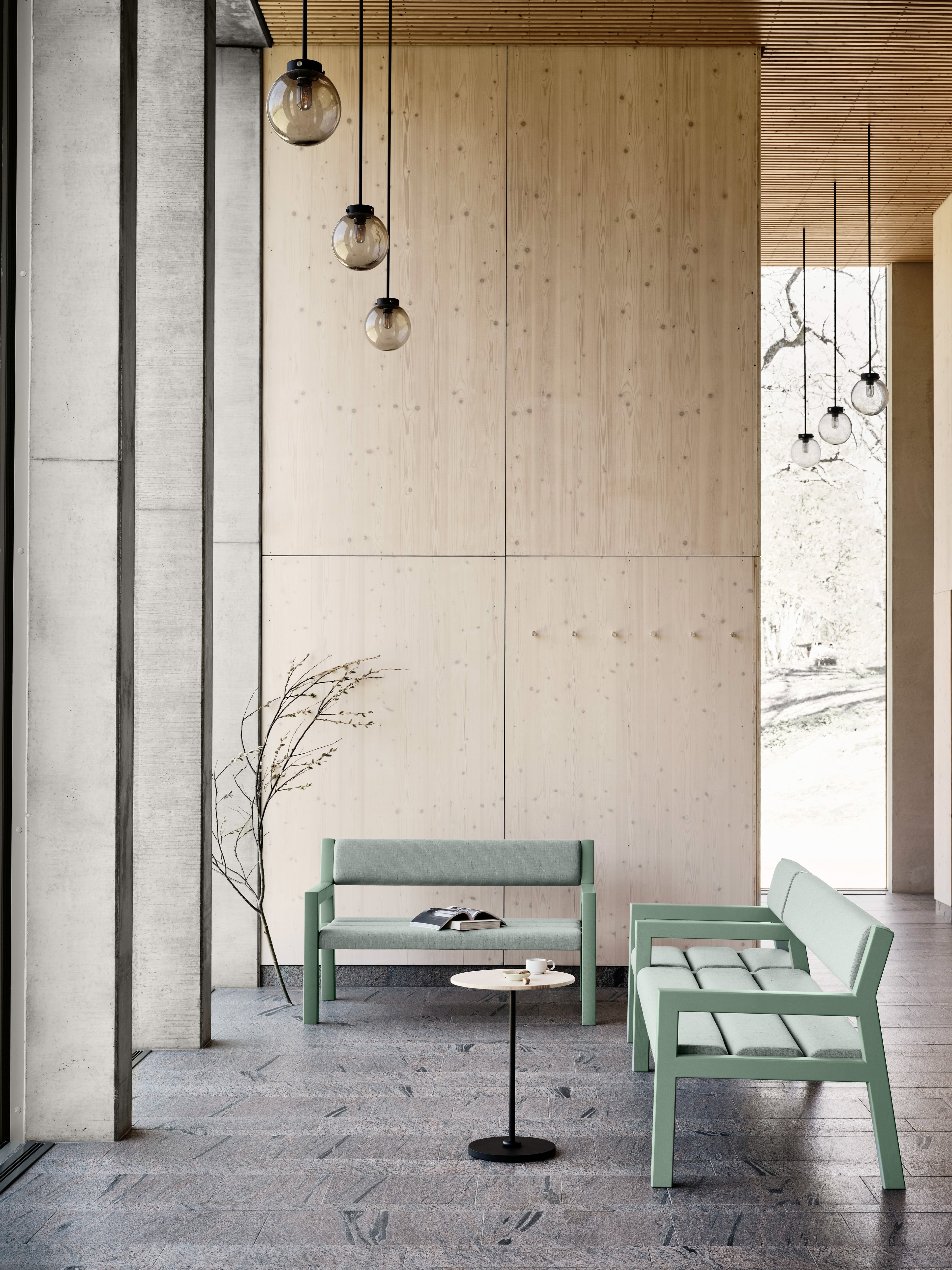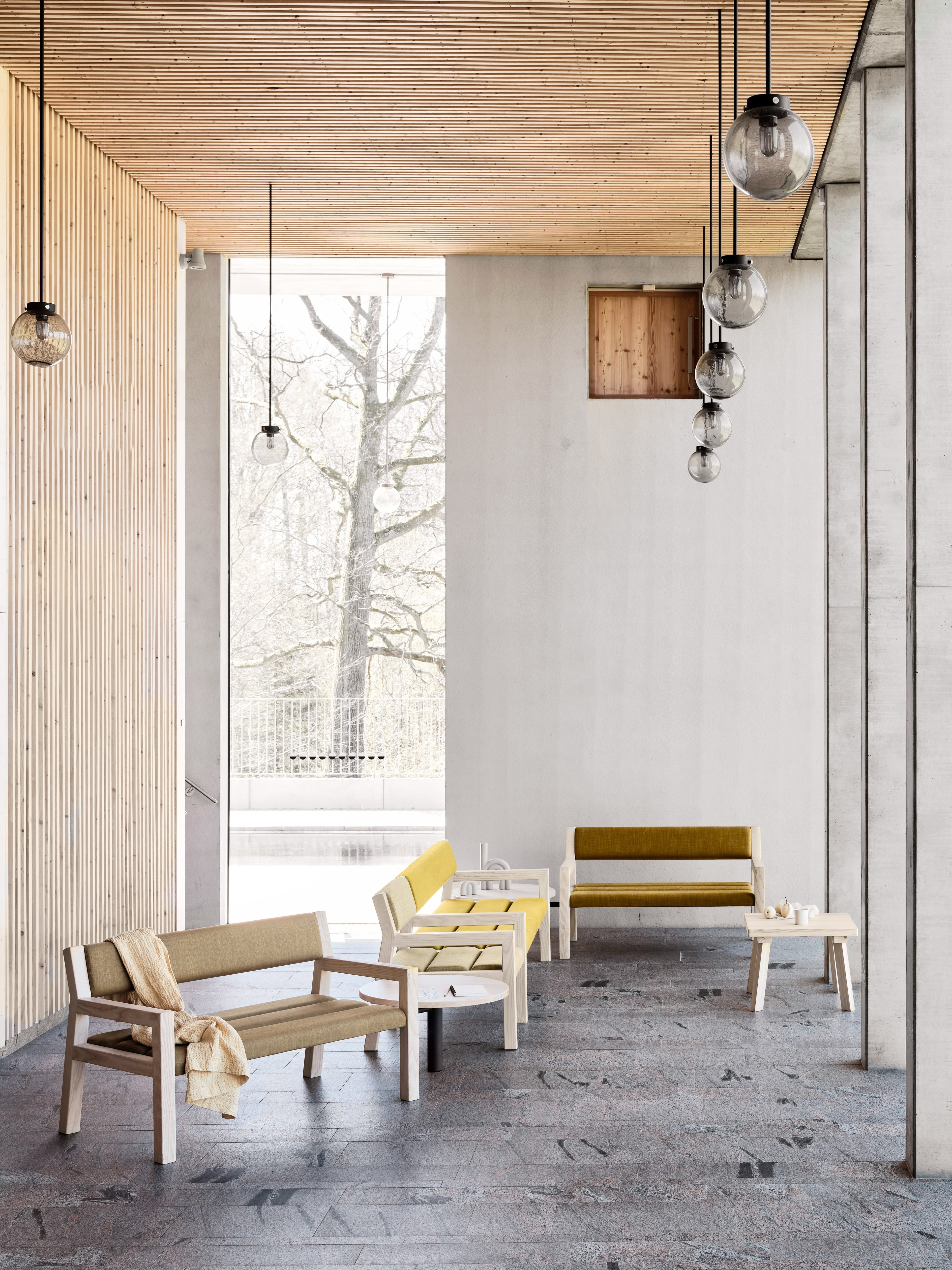 Park+ is available with soft textile or leather cushions, in a wide range of options from our extensive textile library or custom samples. The nimble interlinking table lets 2-seaters, 3-seaters and individual chairs to connect and arrange themselves in whatever configuration you desire. The neatly spaced seat and backrest slats reduce the need for cleaning the seats themselves and the system offers an airy and easy to access space underneath.