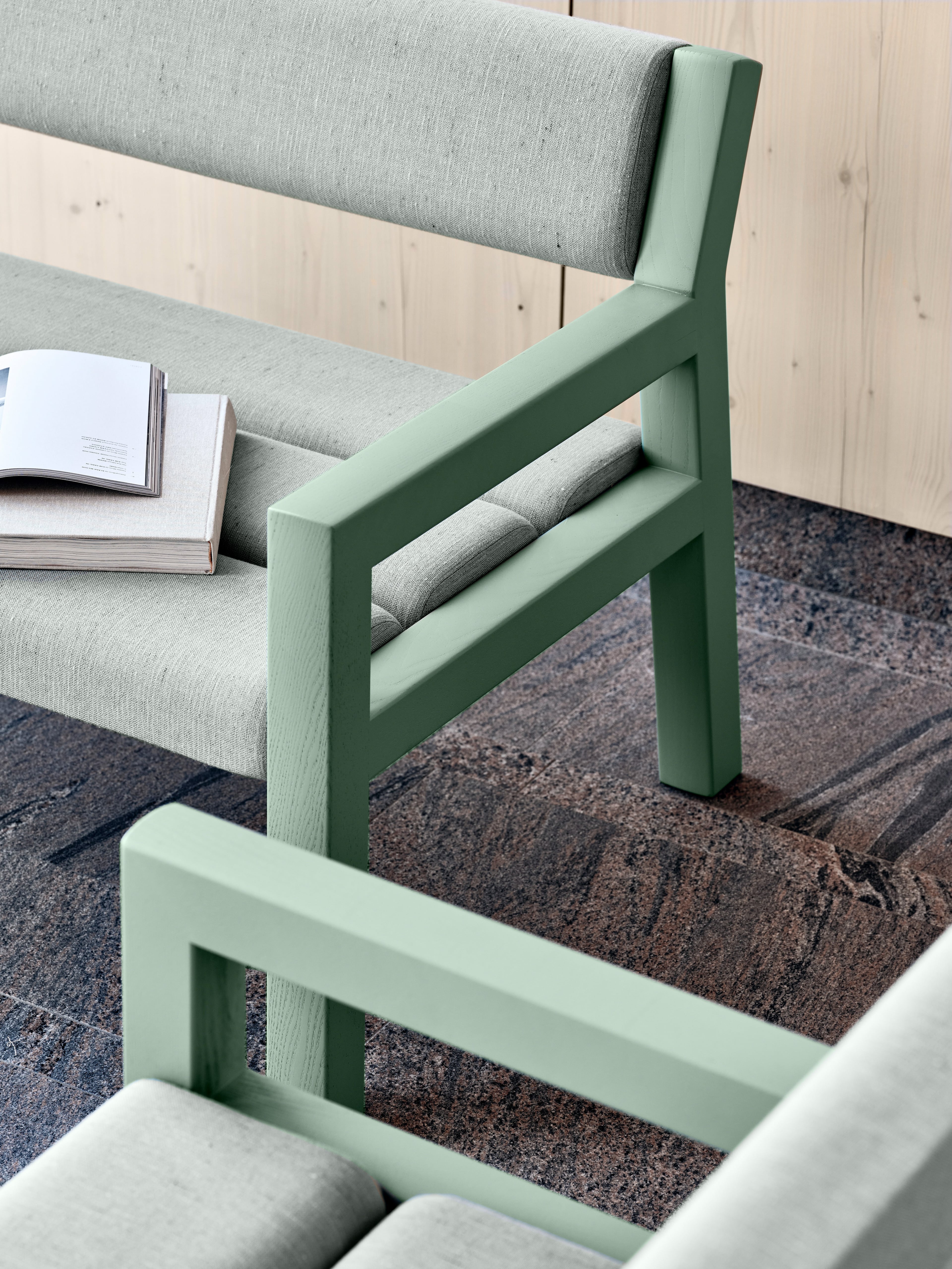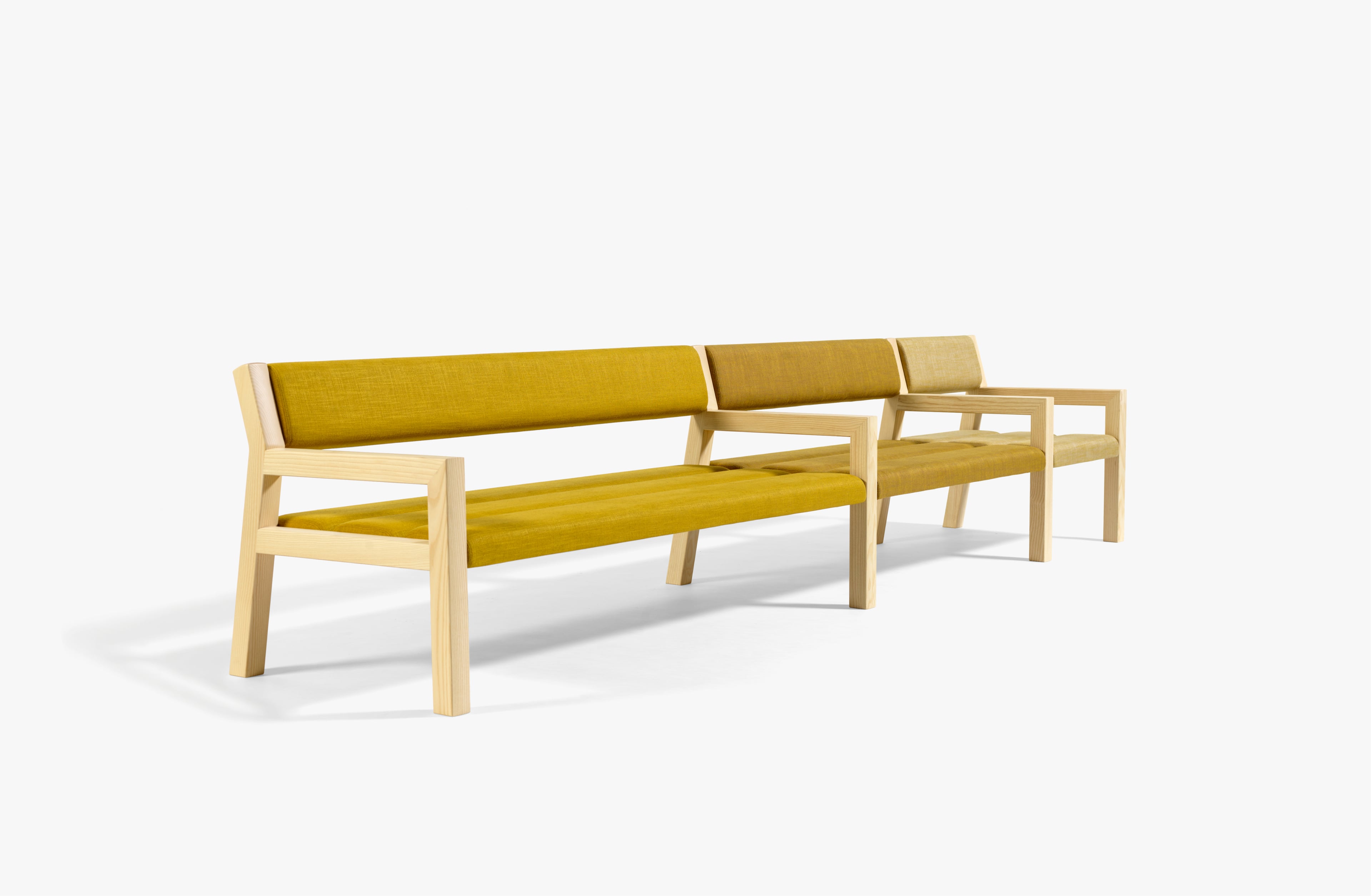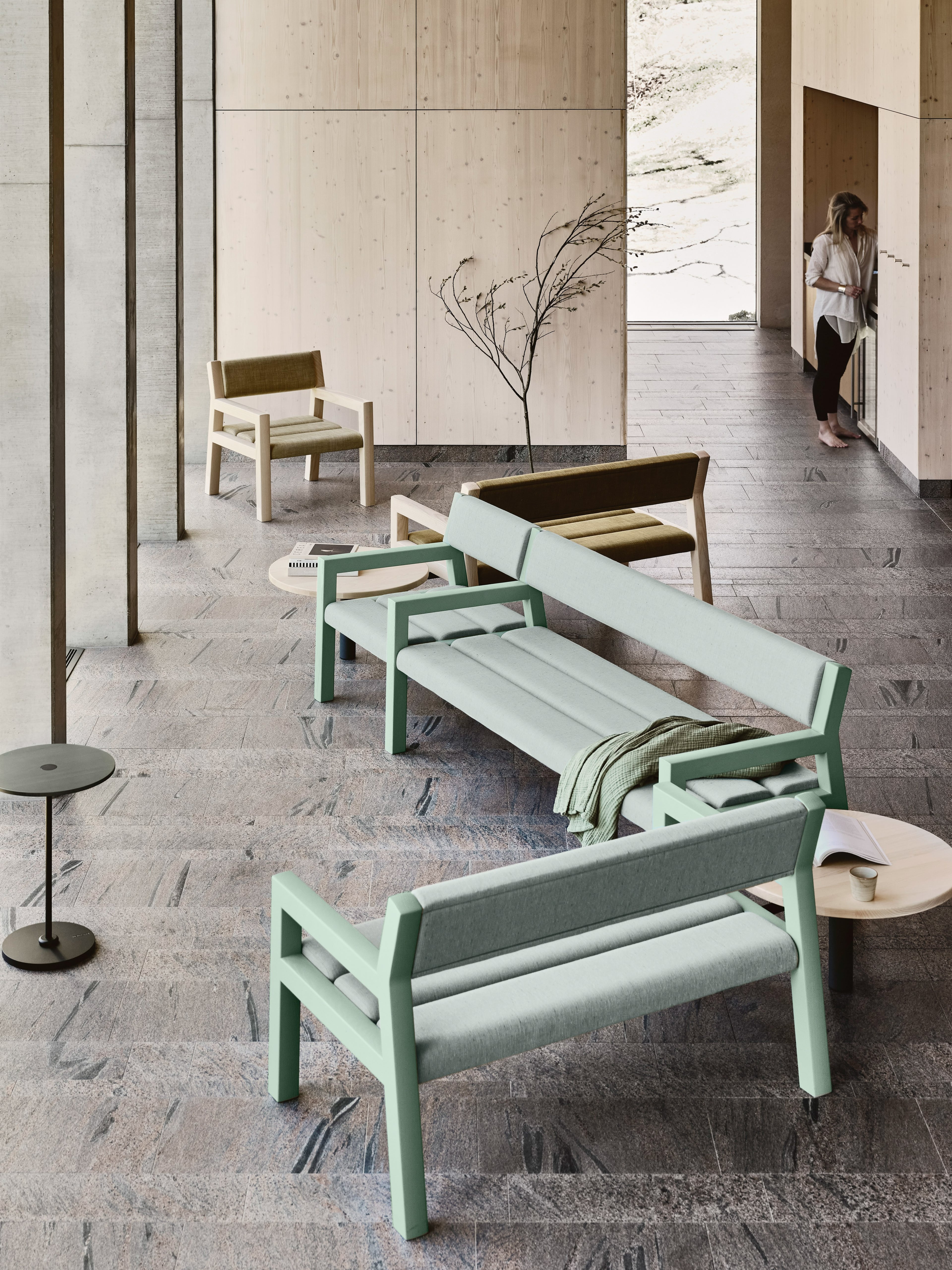 Park+ is available with soft textile or leather cushions, in a wide range of options from our extensive textile library or custom samples. The nimble interlinking table lets 2-seaters, 3-seaters and individual chairs to connect and arrange themselves in whatever configuration you desire. The neatly spaced seat and backrest slats reduce the need for cleaning the seats themselves and the system offers an airy and easy to access space underneath.